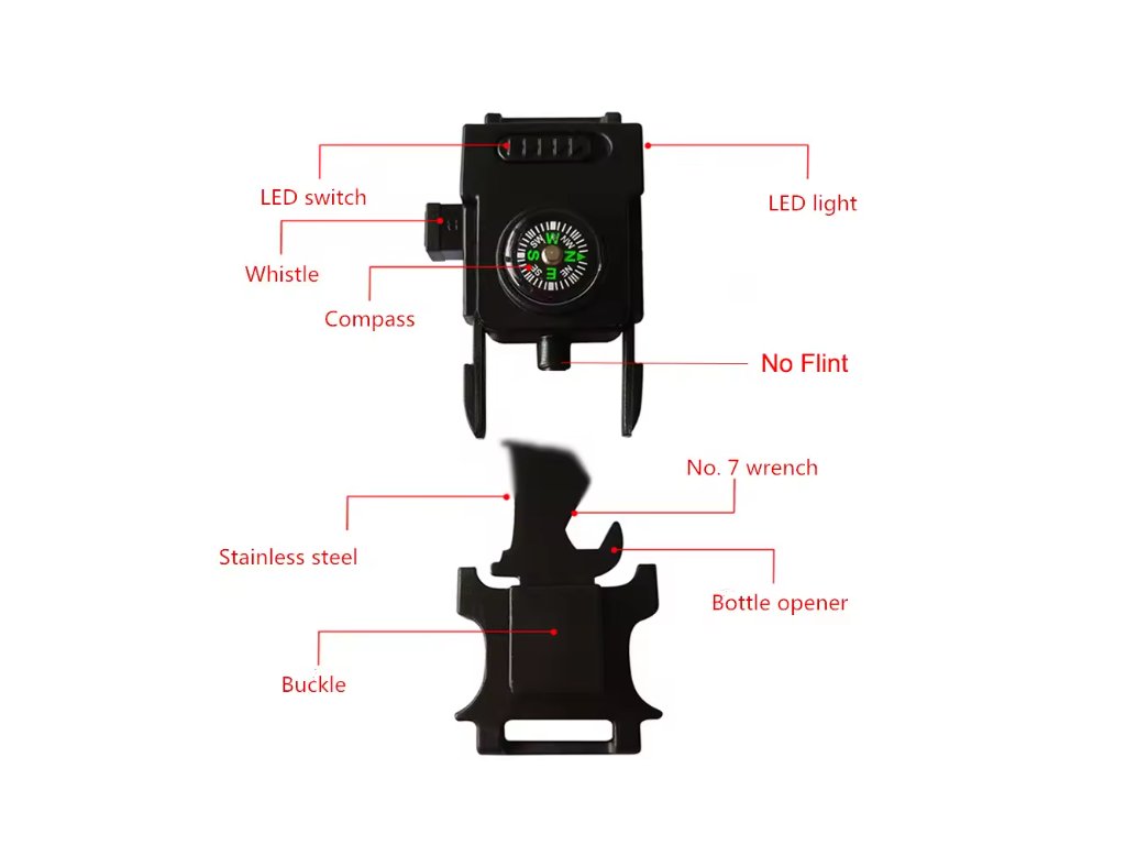 Náramek má spoustu dalších užitečných funkcí pro přežití v přírodě jako je zabudovaný nerezový nůž, píšťalka, otvírák na pivo, případně jej můžete rozplést a získáte 3m padákového lana.